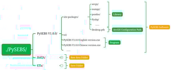 The PySEBS software is compressed into a PySEBS V1.0.0.zip file. The schematic diagram of the PySEBS file structure is shown in Figure 1. The schematic box labeled. /PySEBS/represents a folder named PySEBS in the working directory, where the PySEBS 1.0.0.zip file will be stored after extraction. The PySEBS folder contains two parts: the PySEBS V1.0.0.exe program; and the site-packages folder containing the code libraries (arcpy package, numpy package, pandas package, Pyshp package, etc.) and the configuration Desktop.pth file.
