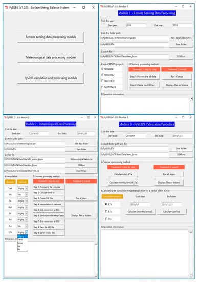 Graphical user interface of PySEBS software. The upper left part is the main menu, the upper right part is the module 1-remote sensing data processing; the lower left part is the module 2-meteorological data processing; and the lower right part is the module 3-PySEBS calculation and processing.