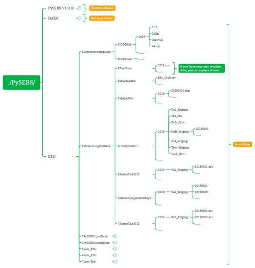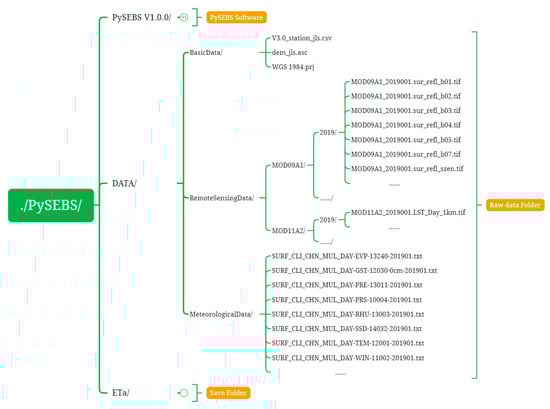 The structure diagram of the path to the initial input data is shown in Figure 3. The path to the basic data is ./PySEBS/DATA/BasicData/. The path to the remote sensing data is ./PySEBS/DATA/RemoteSensingData/MOD09A1/2019/ and ./PySEBS/DATA/RemoteSensingData/MOD11A2/2019/. The meteorological data is saved in the path: ./PySEBS/DATA/MeteorologicalData/.