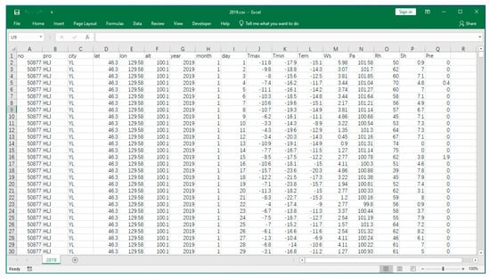 The function of Module 2 is to process the meteorological data and generate the daily file in the .asc format that is required by Module 3. The meteorological data used in this study is China’s surface climate data daily value data set (V3.0), which is derived from the National Meteorological Information Center (http://data.cma.cn/site/index.html (accessed on 30 May 2018)); the platform contains the daily meteorological data from 824 reference weather stations. The meteorological data in the dataset includes atmospheric pressure, air temperature, precipitation, evaporation, sunshine hours, surface temperature, wind speed and direction, and relative humidity at each station. The downloaded original meteorological data is in .txt format and includes all meteorological stations in each folder that need to be preprocessed. Once the downloaded V3.0 weather datasets are placed in the same folder, Module 2 can be used to process the raw data directly. If meteorological datasets from other sources are used, they need to be organized in .csv format and stored in the 1RawData folder. An example of the corresponding path may be: .\PySEBS\ETa\2MeteorologicalData\1RawData\2019.csv.