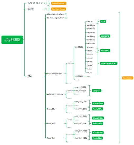 Schematic diagram of the structure of folders 3PySEBSInputData/, 4PySEBSOutputData/, and 5sum_ETa/, 6sum_ETo/, and 7sum_Pre/.