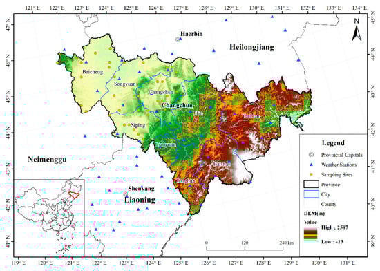 After the development of PySEBS software, the ETa was calculated for spring maize in Jilin Province from 2001 to 2020, and the ETa was analyzed at both temporal and spatial scales during the growing season of spring maize in this study. Jilin Province is located in the central part of northeastern China (Figure 7). The terrain map shows obvious characteristics of high elevations in the southeast and low elevations in the northwest. The latitude varies from 40°50′ to 46°19′N, and the longitude ranges from 121°38′ to 131°19′E. Jilin Province is 769.6 km long from east to west and 606.6 km wide from north to south and has an area of 187,400 km2. As for climate conditions, it belongs to a temperate continental monsoon climate with four distinct seasons. Rain and heat are in the same season, such as a rainy summer with high temperatures and a cold and dry winter. The average winter temperature is below −11 °C, and the average summer temperature is above 23 °C. The annual average sunshine hours are 2259–3016 h. The annual average precipitation is 400–600 mm, and the annual frost-free period is 120–160 days. The climatic conditions of Jilin Province make it an important commodity grain production region in China. Due to the geographical advantage for agriculture, it has become one of the three famous Corn Belts in the world.