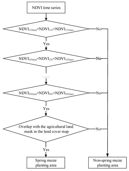 The construction of the decision tree for the extraction of the spring maize planting area in Jilin Province was based on the minimum and maximum time series curves of NDVI for the period of 2001 to 2016. A total of 13 images of NDVI values reconstructed by HANTS using a day-of-year (DOY) calendar from DOY 113 to 305 over 16 years were selected for this study. The pixels between the minimum and maximum NDVI values of the corresponding DOY were the candidate areas for the spring maize planting area. To eliminate the influence of other land uses, the agricultural land in the land cover map provided by the remote sensing data of MCD12Q1 was extracted as a mask. Finally, the spring maize planting area was obtained. The extraction process is shown in Figure 9.