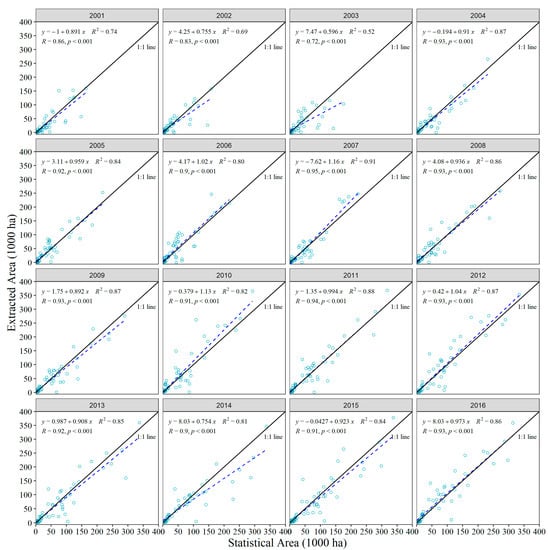 In this study, the identification of the spring maize planting area was based on the NDVI time series curve for the period of 2001 to 2016. Except for 2003 and 2014, the extraction area and statistical area of 56 counties and districts in Jilin Province were basically evenly distributed on both sides of the 1:1 line, indicating that the constructed decision tree could better extract the planting area of spring maize (Figure 10). The relative error of spring maize area extraction from 2001 to 2016 was −4.15%. The lowest extraction accuracy over the years was above 80%, and the average extraction accuracy reached 90.60%. The coefficient of determination (R2) values of the statistical area and the extracted area of spring maize were greater than 0.8 except for 2001 to 2003, and the overall R2 was 0.81, which indicated that the extraction method of the spring maize area used in this study fit well with the actual situation.