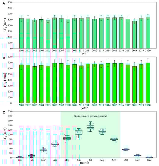 The temporal distribution pattern of ETa during the spring maize growing period (May to September) from 2001 to 2020 in Jilin Province is shown in Figure 11. The average cumulative ETa during the growing period of spring maize in Jilin Province ranged from 475 to 544 mm, with a multi-year average value of 517 mm and an average standard deviation value of 43 mm (Figure 11A). The lowest and highest ETa happened in 2008 and 2020, respectively. The average annual cumulative ETa differed from 632 to 694 mm, with a mean value of 666 mm, and the standard deviation varied from 50 to 86 mm, with a mean value of 65 mm (Figure 11B). The monthly distribution pattern of ETa showed a trend of increasing and then decreasing, with the monthly average ETa of 2, 9, 34, 58, 83, 110, 132, 114, 78, 35, 9, and 2 mm from January to December, respectively, with the highest value of ETa in July. The cumulative ETa was 517 mm from May to September during the spring maize growing period (Figure 11C).