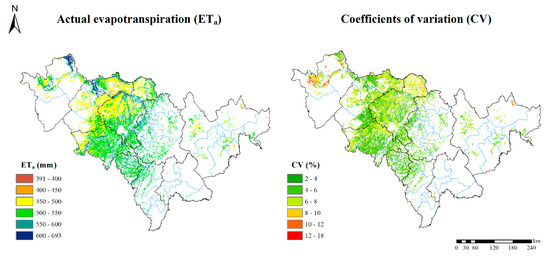 Multi-year average ETa (2001–2020) and its coefficient of variation (CV) during the growing period of spring maize in Jilin Province.