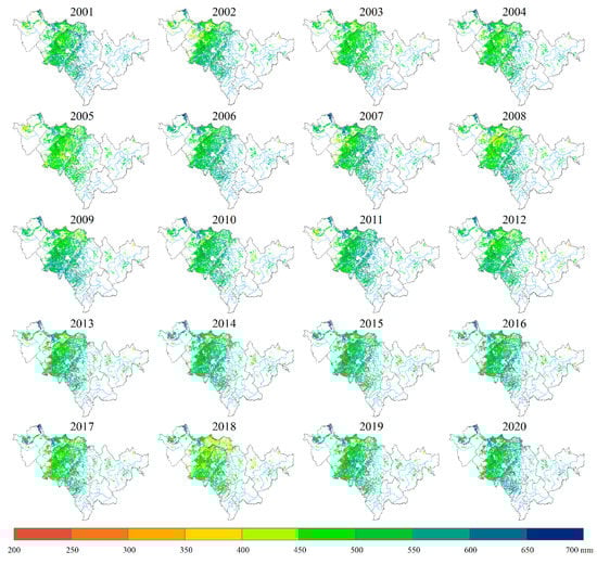 In this study, the ETa values of spring maize in Jilin Province from 2001 to 2020 were between 391 mm and 693 mm, with a multi-year average of 517 mm. This was similar to the results of other related studies in Jilin Province. Jiang et al. [51] pointed out that the maximum error value of ETa estimated by using remote sensing data is reasonable within ±20%. However, Seguin et al. [52] suggested that the maximum error of ETa estimated by remote sensing changes with the actual applications, and the absolute value is usually reasonable around 15–30%. Since there is no relevant flux tower data in the study area that can be used directly for the validation of this model for ETa estimations, a relevant literature review was conducted to validate the estimation effectiveness of this PySEBS model on ETa in Jilin Province. The results of relevant literature studies on spring maize ETa in Jilin Province at the regional scale were 514 mm on average, while the average result of the PySEBS model was 517 mm, with a relative error of less than 1%, indicating a good applicability of the modified model in regional studies (Table 2).
