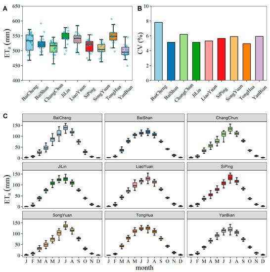 ETa of spring maize in each city of Jilin Province. (A) Multi-year average ETa in each city during the spring maize growing season from 2001 to 2020, (B) coefficient of variation (CV) of ETa during the spring maize growing season in each city from 2001 to 2020, and (C) monthly ETa in each city.
