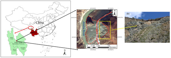 The Jizong Shed-Tunnel landslide is located in Ladong Mountain on the east bank of the Jinsha River, in Diqing Tibetan Autonomous Prefecture, Yunnan Province (Figure 1). The geographic coordinates of the center of the landslide source area are 99°23′43″E, 28°7′53″N. This is the active landslide that can be seen on the G214 National Highway. As one of the main highways of the Chinese transportation network, the G214 National Highway is the only main transportation road from Yushu area to Xining and Sichuan-Tibet. It is the economic line and lifeline of the surrounding areas. Therefore, maintaining the safety of G214 National Highway is an important task to guarantee the economic stability and social stability of the surrounding areas [34].