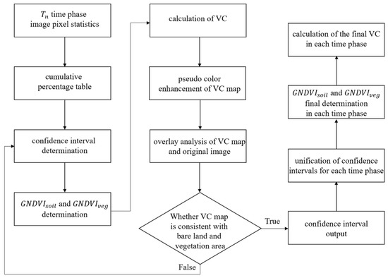 When using the pixel dichotomy model to calculate the VC, the most important thing is to obtain the values of and . In the actual situation, according to the definition of the parameters, these two values will change with time and space [42]. At present, we mainly count the value of GNDVI from the remote sensing images and set the confidence interval according to the cumulative percentage to define the value of and . Because there are many remote sensing images in this article, in order to avoid the result analysis error caused by different confidence interval selections, this article makes multiple adjustments and calculations to obtain a unified confidence interval. The VC calculation flow chart is in Figure 2, and the specific operation steps are as follows: