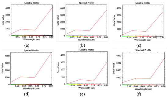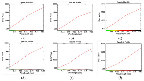 The bare ground spectrum curves of different fusion images. (a) MS image; (b) GS fusion image; (c) PCA fusion image; (d) NND fusion image; (e) Pansharpening fusion image; (f) HPF fusion image.