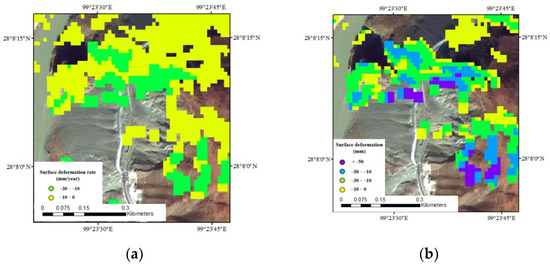 We can find that the settlement rate of the Jizong Shed-Tunnel landslide along LOS direction is mostly between 0 mm/year and 30 mm/year from Figure 7a. According to the sliding speed threshold in Table 5, that is also the annual average surface deformation rate, this landslide is identified as the very slow type or the slightly slow type [53], so we find that the Jizong Shed-Tunnel landslide is in the landslide creep stage after a large slide in 2015. From Figure 7b, it can also be found that the Jizong Shed-Tunnel landslide has obvious settlements as a whole, reaching more than 50 mm in some places, which also proves that the landslide is sliding.
