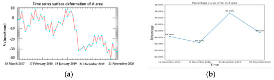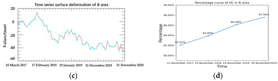 According to Figure 9c, the maximum cumulative settlement at the center of B area is 45 mm. Except for a certain uplift from March to November 2017, the cumulative deformation of this area shows a downward trend, indicating that the area has been creeping and deforming. From the percentage change curve of VC in Figure 9d, it can also be seen that the percentage of low and medium VC increased from 2017 to 2020, indicating a decline in VC. The overall trend is the same as the change in the surface deformation.