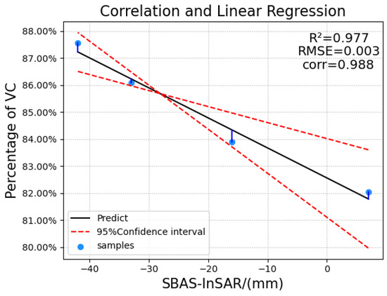 According to Figure 10, the correlation coefficient between the cumulative surface deformation and VC is 0.988, and the of the linear regression model is 0.977, indicating that the two methods have a significant linear correlation. When the deformation of the land surface subsidence increases, the pixels with medium and low VC also gradually increase, which provides reliable support for monitoring the Jizong Shed-Tunnel landslide using abnormal vegetation information. Simultaneously, the root mean squared error (RMSE) values of the error analysis and the upper and lower limits of the 95% confidence intervals are both small. This further proves the reliability of the accuracy analysis in B area.