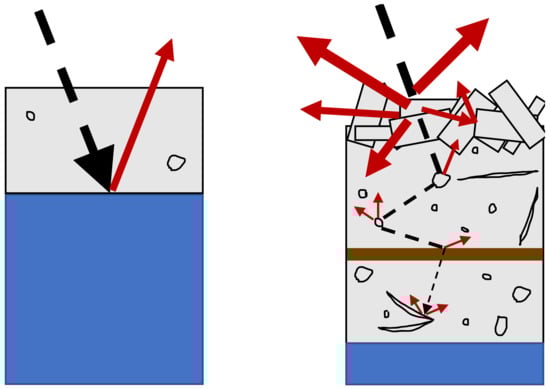 Schematic diagram of microwave interactions with physical properties of river ice. Black dashed arrows represent incident microwaves and red solid arrows represent scattered radiation. In smooth, relatively thin ice with few impurities, incident microwave radiation can penetrate the ice cover and almost all scattering is due to the dielectric change at the ice-water interface. A more complex ice cover contains more scattering mechanisms and results in higher amounts of backscattered radiation.
