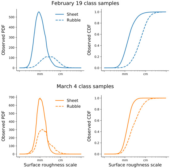 Figure 6 shows the observed PDFs and CDFs of surface roughness measurements for the sheet ice and rubble ice class samples selected from the two aerial survey dates with an area threshold value of 50%. Roughness PDFs for sheet ice and rubble ice overlap on both dates, but there is a larger separation between the classes in the 19 February samples (Figure 6, top row) than in the 4 March samples (Figure 6, bottom row). This result is not surprising given the relative shapes of the density functions containing all roughness measurements on the two survey dates (Figure 5).