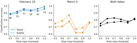 Figure 7 shows RF classification accuracies using a variety of training datasets and classification area threshold values. Fewer samples are available to include in the training datasets as the class area threshold increases. 80 samples of sheet ice and rubble ice (160 samples total) were selected from each date with an area threshold of 50%, down to 24 samples of both classes (48 samples total) with a threshold of 100%. Note that samples from both dates are merged for the combined-date model, so the training datasets are twice as large as compared to those for the single-date models. For the 19 February model, accuracy generally increases as the threshold increases, but the 4 March model has a peak at 70%. This indicates that increasing the area threshold creates more separation between samples in the two classes, and therefore it is easier for the model to classify correctly. However, with our relatively small dataset there is a point where the total sample size becomes too small to properly train the classifier. The optimum threshold value for our dataset appears to be 70%, where the 19 February model achieves 96% and 94% accuracy for sheet ice and rubble ice, the 4 March model achieves 78% and 87% accuracy, and the combined model achieves 83% and 77% accuracy.