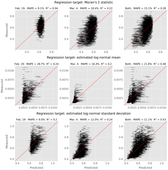 RF regression results for Moran’s I statistic and estimated log-normal mean and standard deviation distribution parameters. RF models are trained with input data sets with samples from 19 February only (left column), 4 March only (middle column), and both survey dates combined (right column). Red dashed lines are 1-1 lines representing perfect regression accuracy.