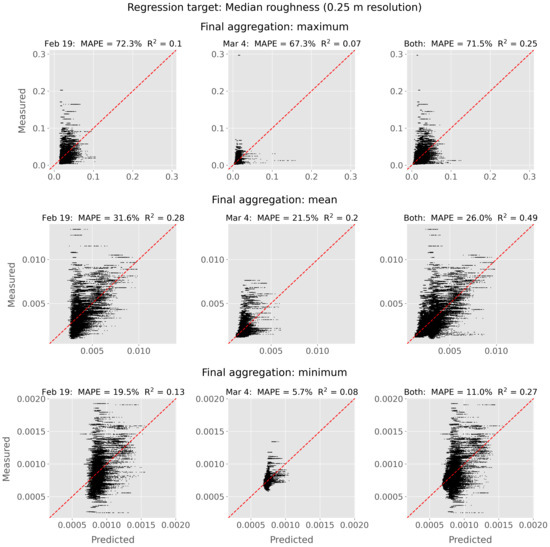 Figure 9 shows RF regression results for a single subgrid-statistic roughness metric. The first step in the derivation of this metric was calculated as the median surface roughness at a 0.25 m subgrid resolution (i.e., moving from the left panel to the middle panel in Figure 4). The three rows of plots in Figure 9 represent regression results for these intermediate measurements aggregated using the three different aggregation operations (i.e., moving from the middle panel to the right panel in Figure 4 using maximum, mean, and minimum aggregation operations). Note that the three rows have different y-axis limits, which altogether span two orders of magnitude. The columns in Figure 9 again represent RF models trained with input data sets from 19 February only (left column), 4 March only (middle column), and both dates combined (right column). Although significant spread is present in the regression results of all nine model configurations, the 4 March data are more tightly clustered than the 19 February data for all aggregation operations. This is an intuitive result when considering the density functions for surface roughness measurements from the two survey dates (Figure 5). Data outliers are largest for the datasets derived using maximum final aggregation (top row) and smallest for datasets derived using minimum final aggregation (bottom row), which correspond to the highest and lowest MAPE values, respectively. Figures similar to Figure 9 for all subgrid-statistic regression targets can be found in the Supplemental Data. Although MAPE values change slightly for other subgrid-statistic targets, regression model performance for all targets follows the general patterns discussed above.