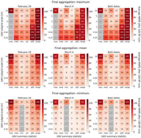 Mean absolute percentage error (MAPE) for RF regression targets for RF models trained with input data sets with samples from 19 February only (left column), 4 March only (middle column), and both survey dates combined (right column). Each grid cell represents a target surface roughness metric calculated using a particular statistic (x-axes) and subgrid spatial scale (y-axes). The final operations applied to aggregate the subgrid roughness metrics at the 10 m Sentinel-1 scale are the maximum (top row), mean (middle row), and minimum (bottom row). Values reported in grid cells are the average MAPE after 100 RF regression model runs. Grey cells indicate redundant model runs that were not conducted (see text).