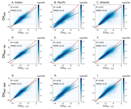 Scatter plots of log of ChlOC-CCI vs. (A–C) ChlSVR, (D–F) ChlMLP-9% and (G–I) ChlMLP trained on 80% of the dataset, for each oceanic basin between 50° S and 50° N and over 1998–2015. The ChlOC-CCI vs. reconstructed Chl regression lines are plotted in black and the 1:1 regression lines are plotted in red. The figure is color-coded according to the density of observations.