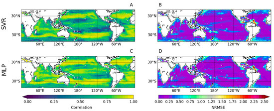 “Consistent with the scatterplots, ChlOC-CCI temporal correlations with ChlSVR are significantly lower than with ChlMLP (Figure 3A,C; r = 0.65 vs. 0.75 and NRMSE = 0.31 vs. 0.26 on a global scale, respectively). ChlOC-CCI - ChlSVR correlations are higher than 0.8 (p < 0.001) over limited regions such as the Atlantic, Indian, and Pacific subtropical areas (Figure 3A). The MLP allows for a significant improvement in the correlation with ChlOC-CCI with values higher than 0.75 over most of the global ocean (Figure 3C). Areas of high and low NRMSE are similarly distributed for ChlSVR and ChlMLP (Figure 3B,D). For instance, in both cases, NRMSE is higher at the highest latitudes and along the Amazon plume in the Atlantic Ocean. Although the MLP slightly reduces NRMSE compared to the SVR, biases in reference to ChlOC-CCI still remain in these regions. …”