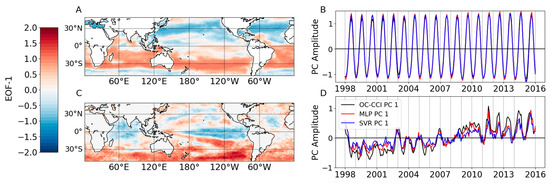 First mode of the ChlOC-CCI (A) seasonal and (C) interannual EOFs over 1998–2015, and their associated principal components (B,D), respectively. ChlMLP and ChlSVR PCs obtained from the ChlOC-CCI EOF projections are reported in (B,D).