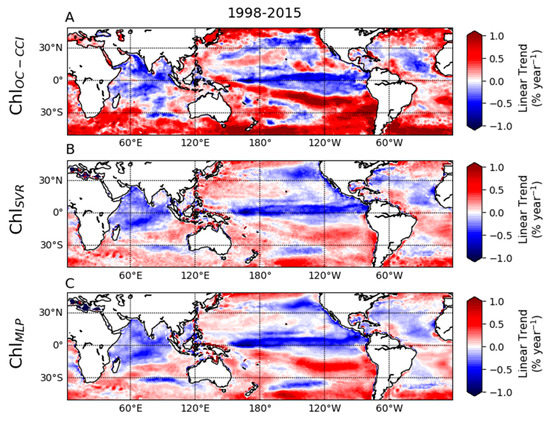 Linear log of (Chl) trend (in % year−1) calculated over 1998–2015 from the monthly (A) ChlOC-CCI, (B) ChlSVR, (C) ChlMLP.