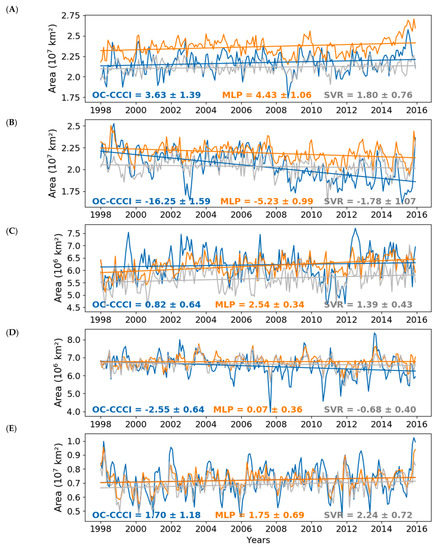 Time series of the monthly mean area (km2) with surface Chl less than or equal to 0.07 mg.m−3 between 5° and 45° N/° S latitude with the seasonal cycle removed in the (A) North Pacific, (B) South Pacific, (C) North Atlantic, (D) South Atlantic and (E) Indian Oceans. ChlOC-CCI is in blue, ChlSVR in grey and ChlMLP in orange. Straight lines are the linear trends calculated as in Figure 5. The average trends and standard deviation are also indicated.