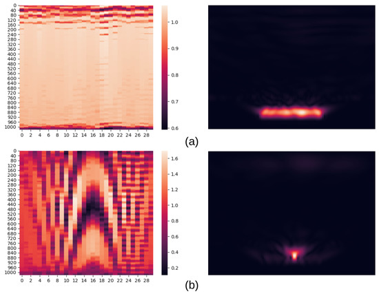 Four examples of two RealSAR datasets are shown in Figure 5. Left image of each example is a heatmap of raw data (an example from RealSAR-RAW), while right one is an image reconstructed using that data (an example from RealSAR-IMG). Aforementioned dimensions of matrices in RealSAR-RAW dataset can be seen in the raw data examples. Horizontal axis represents number of steps in the GBSAR measurement (in our case 30 steps), while vertical axis number of frequency points in one FMCW frequency sweep (in our case 1024). Four depicted examples stand for four scenes: (a) empty scene, (b) scene with aluminium bottle, (c) with aluminium and glass bottles, and (d) with all three bottles. The examples highlight three possible problems for image-based classification: