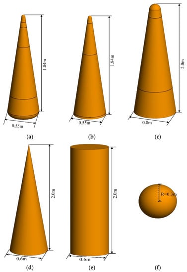 The geometric models of the six targets. (a) Warhead 1; (b) warhead 2; (c) warhead 3; (d) decoy 1; (e) decoy 2; (f) decoy 3.