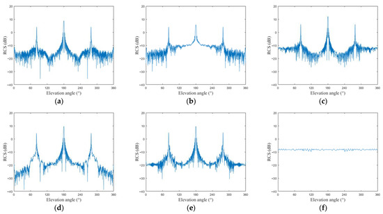 Variation of the static RCS (dB) of six targets with the elevation angle. (a) Warhead 1; (b) warhead 2; (c) warhead 3; (d) decoy 1; (e) decoy 2; (f) decoy 3.
