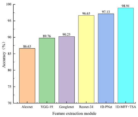 Figure 8 shows the recognition results of different network structures used for feature extraction. Due to the fusion of multi-level features and the extraction of the global temporal cues for the range feature sequence and frequency feature sequence, the proposed method can achieve a recognition rate of 98.91%.
