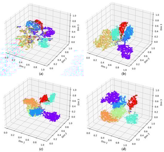 Moreover, we research the way that the DGCCA-CL module affects the distribution of the fused features and recognition. In addition, we use the T-SNE algorithm [63], which is one of the best feature downscaling and visualization methods to visualize the distribution of fused features. Figure 9 shows the visualization results with different methods after optimization.