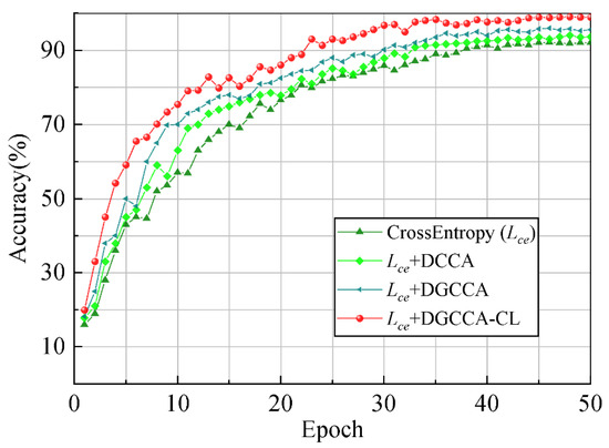 Figure 10 shows the variation of the recognition rate of different optimization methods with the number of iterations. We can see that the addition of CCA can not only accelerate the convergence of the network, but also improve the accuracy of the network. Moreover, the network optimized by DGCCA-CL has the fastest convergence rate among the contrasting subspace methods, and its accuracy increases by about 3% compared with DGCCA.