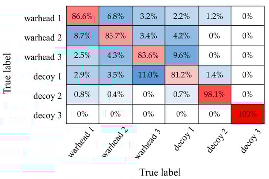 Figure 12 shows the confusion matrix of our method for six targets with the SNR of −10 dB, which shows the classification effect of our method more clearly. We can see that it is easier to distinguish decoy 2 and decoy 3 than other targets because the tumbling motion shows obvious features. Moreover, because of the similarity of coning and nutation and the similarity of shapes, misclassification mostly happens among warhead 1, warhead 2, warhead 3, and decoy1.