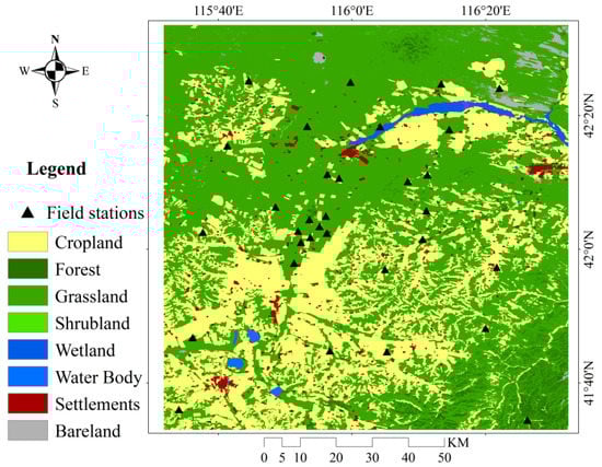 The study area is located in the Shandian River Basin and surrounding watersheds in North China, within an area of approximately 10,000 km2 (115.5–116.5°E, 41.5–42.5°N) (Figure 1). It has a semi-arid continental climate, with a maximum inter-annual temperature of approximately 36 °C and a minimum temperature of approximately −36 °C [19]. The average annual rainfall and evaporation are approximately 375 and 1188 mm, respectively. Precipitation is concentrated in summer from June to September, accounting for more than 80% of the annual rainfall. Aeolian sandy soil is the main soil type, accounting for approximately 50% of the total area, followed by 8% meadow soil. The terrain of the basin is relatively flat and dominated by plains, hills, and depressions. The land cover types include farmland, forest, grassland, shrubs, wetlands, water bodies, residential land and bare land, of which the main types are farmland and grassland (Figure 1).