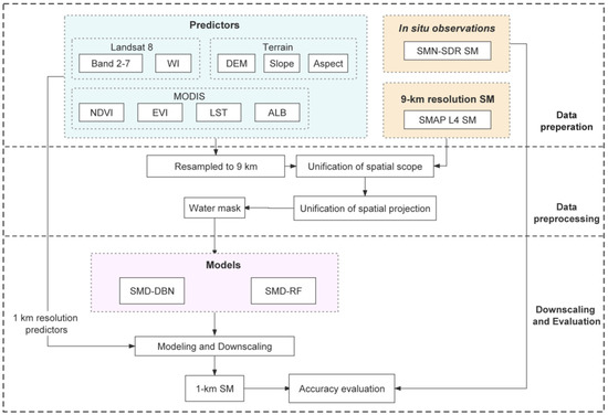 Microwave sensor-based SMs are widely used because data acquisition is rarely affected by atmospheric conditions, vegetation disturbances, and day–night cycles, but the low resolution limits their application. Aiming at the practical needs of SM products with high spatial resolution, this study presents the SMD-DBN model based on a deep confidence network, improving the SMAP L4 SM data resolution from 9 to 1 km. In situ observations from the new SM and temperature wireless sensor network (i.e., SMN-SDR) were used to evaluate the performance of SMD-DBN.