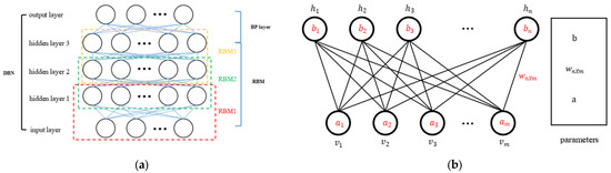 DBN is a DL network formed by stacking multiple Restricted Boltzmann machines (RBMs) and a backpropagation (BP) neural network (Figure 3a). When the correlation between the input data is unknown, it can learn and construct a nonlinear relationship between the input and output by referring to the feature values and labels of the input dataset. DBN can also rearrange shallow features into deeper abstract features so that more complex associations between features can be further excavated. The RBM in DBN consists of a visible layer (visible unit) and a hidden layer (hidden unit), as shown in Figure 3b. The output of the hidden layer of the previous layer of RBM is input into the next layer of RBM, and this task is repeated several times. The output of the last RBM is input to the following BP layer. The middle layers of the RBM are fully connected, while the adjacent layers are not connected to each other [50].