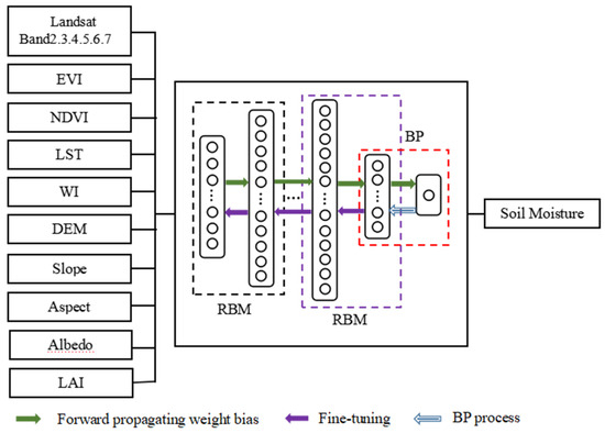 A DBN-based downscaling model between the predictors and SM was established and named Soil Moisture Downscaling-Deep Belief Network (SMD-DBN). Figure 4 shows the model structure.