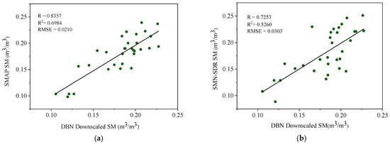 Scatter plot of SM from DBN downscaling versus original SMAP SM data (a) and SMN-SDR in situ measurements (b).