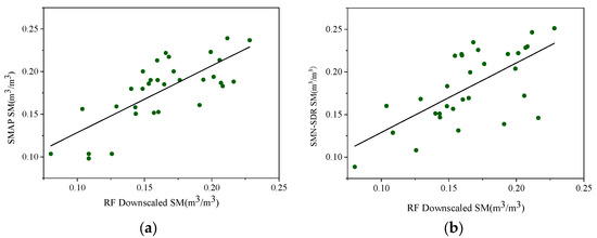 Scatter plot of SM from SMD-RF downscaling versus original SMAP SM data (a) and SMN-SDR in situ measurements (b).