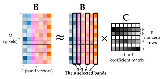 The SSR model was used to solve BS problems in the past [24,25,26,27,28,29]. Let L and N be the total numbers of bands and spectral pixels in a HSI cube, respectively (N >> L). Suppose represents the band vector of band , and represents the HSI matrix. The optimization of SSR-based BS is formulated as: