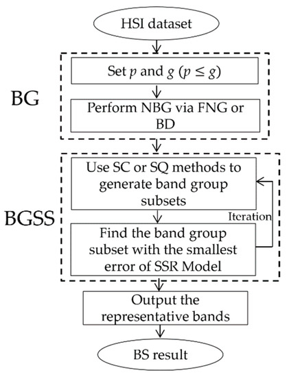 - In order to reduce the information redundancy in the final selected bands, a novel two-stage BS method is proposed, called band grouping-based SSRBSS (BG-SSRBSS). In BG-SSRBSS, the BG is adopted as preprocessing to partition all the bands into several non-overlapping band groups; then, BGSS is performed to find the most influential band group subset via SC or SQ search. The representative bands of the optimal band group are taken as the BS result. It is worth mentioning that BG-SSRBSS integrates SSRBSS into one framework.
