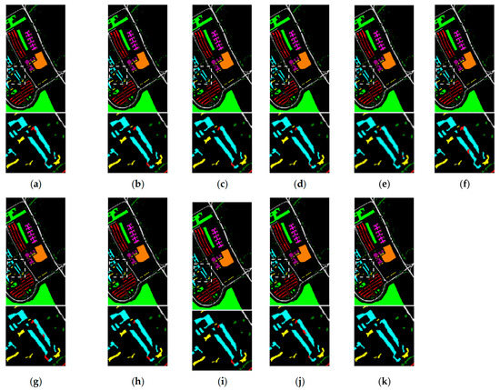 Classification maps generated by HybridSN using different BS methods for the Pavia dataset: (a) Full bands; (b) UBS; (c) OMP-BS; (d) PBS; (e) FNGBS; (f) SQ CCBSS; (g) LCMV-BSS; (h) SQ SSRBSS; (i) SC FNG-SSRBSS; (j) SQ BD-SSRBSS; (k) Ground truth.