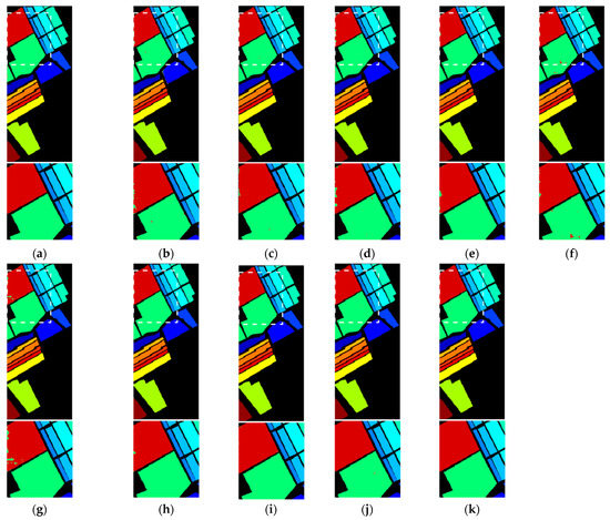 Classification maps generated by HybridSN using different BS methods for the Salinas dataset: (a) Full bands; (b) UBS; (c) OMP-BS; (d) PBS; (e) FNGBS; (f) SQ CCBSS; (g) LCMV-BSS; (h) SC SSRBSS; (i) SQ FNG-SSRBSS; (j) SQ BD-SSRBSS; (k) Ground truth.