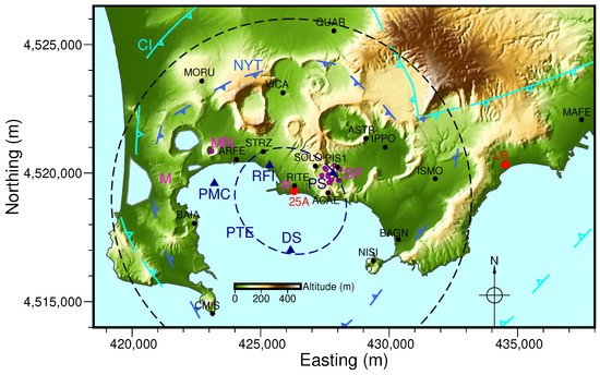 Map of the Campi Flegrei caldera, UTM WGS84 33N coordinates. Colors give topography [3]. Cyan and light blue discontinuous lines with triangles indicate the Campanian Ignimbrite (CI) and Neapolitan Yellow Tuff (NYT) caldera borders, respectively (adapted from [2]). Magenta labels and dots: M, Mofete area; MN, Monte Nuovo; P, Pozzuoli; SF, Solfatara fumarolic field. Red labels and circles: 25A, leveling benchmark in the area of maximum vertical displacement; LR, reference benchmark for levelings. Black labels and dots: continuous GPS stations [4] used to validate Sentinel 1A displacement time series; GPS and SAR displacements are referred to MAFE for validation. Blue labels and triangles: PS, injection point of magmatic fluids into the hydrothermal system [5]; RFI, area of repeated fluid injections during 1983–1984 [6]; PMC, area of the fluid transfer connection between Pozzuoli and Mofete/Monte Nuovo where the spatial 1983–1984 seismic pattern turns from E-W to NW-SE [6]; DS, center of the deep reservoir contributing to 2015–2022 deformation. Blue label and dashed ellipse: PTE, border of the around 3500 m deep sill-like reservoir [5]. The black dashed circle bounds the area where EOFs of SAR displacements are computed.