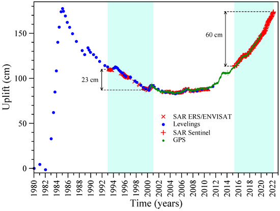 Ground level changes in the area of maximum vertical displacement. Blue dots, leveling data [5] at benchmark 25A referred to LR (see Figure 1). Red crosses and pluses, median vertical displacement referred to LR inside a 200 m radius circular area around benchmark 25A from ERS/ENVISAT and Sentinel-1A images, respectively. Green dots, GPS vertical displacement of RITE referred to a net of six stations of the INGV RING (Rete Integrata Nazionale GNSS) network located outside the Neapolitan volcanic area [4]. Cyan bars indicate the two time periods—1993–2000 and 2015–2022—investigated in this work.