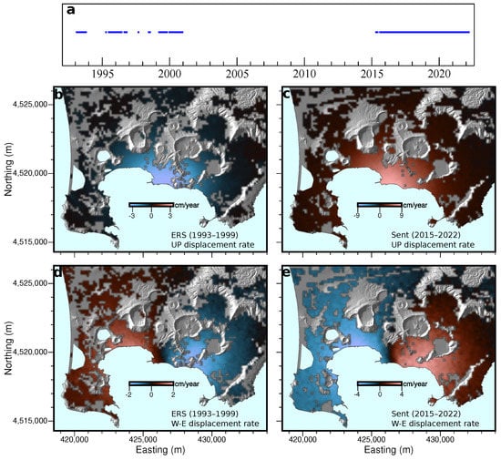Time series of SAR vertical and horizontal displacements. (a) Dates of vertical and horizontal displacement data used in this work. (b) Mean upward displacement rate during 1993–1999, ERS/ENVISAT. (c) Mean upward displacement rate during 2015–2022, Sentinel-1A. (d) Mean eastward displacement rate during 1993–1999, ERS/ENVISAT. (e) Mean eastward displacement rate during 2015–2022, Sentinel-1A.