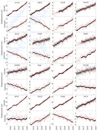 Comparison between GPS and Sentinel-1A SAR vertical and eastward displacements for the GPS stations within the dashed black circle in Figure 1. GPS displacements (black dots) are referred to MAFE (see Figure 1); SAR displacements (red dots) are referred to the median value within a circular area, 200 m in radius, centered on MAFE.